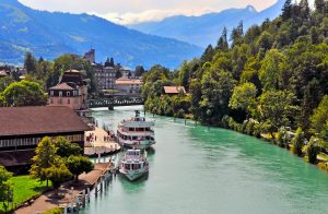 إنترلاكن ومعناها (بين بحيرتين). وكما يوحي اسمها تقع إنترلاكن بين بحيرة ثون وبحيرة برينز، وتحيط بها بعض أعلى قمم سويسرا مما يجعلها جغرافيا مكانًا رائعا للمناظر الخلابة في كل اتجاه. تعتبر هذه المدينة قاعدة مثالية للإستمتاع بالعطلات الطبيعية في سويسرا، إما على ضفاف البحيرة أو في العديد من مسارات المشي التي تبدأ في Harder Kulm، وهي نقطة رؤية بانورامية على ارتفاع 1،322 متر يمكن الوصول إليها عن طريق القطار الجبلي المائل. بما أن إنترلاكن تقع في قلب بيرنيز أوبرلاند، فإن القمم الكبيرة للمنطقة (أيغر، مونش، ويونغفراو) يمكن الوصول إليها من خلال قطارات السكك الحديدية في جبال الألب.